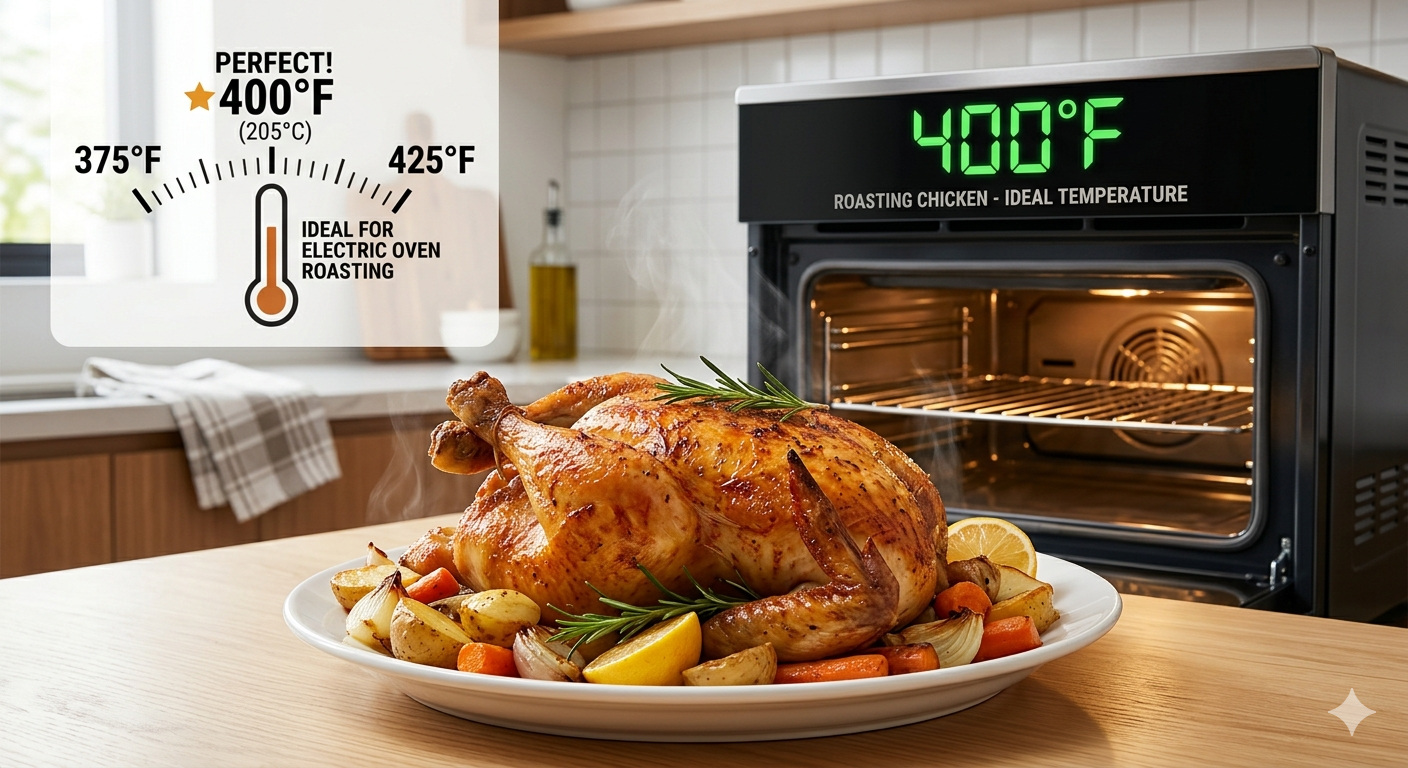 Mattrygghet krever en innvendig temperatur på 165 °F , uavhengig av ovnstemperaturen som brukes. Mens steking ved 400°F er det "søte stedet" for tekstur, er ovnstemperaturen bare kjøretøyet for å nå det sikre interne målet. I en elektrisk ovn må du være forsiktig med store fugler (over 5 lbs); de kan kreve en lavere temperatur på 375°F for å sikre at midten er gjennomstekt før huden brenner seg.
